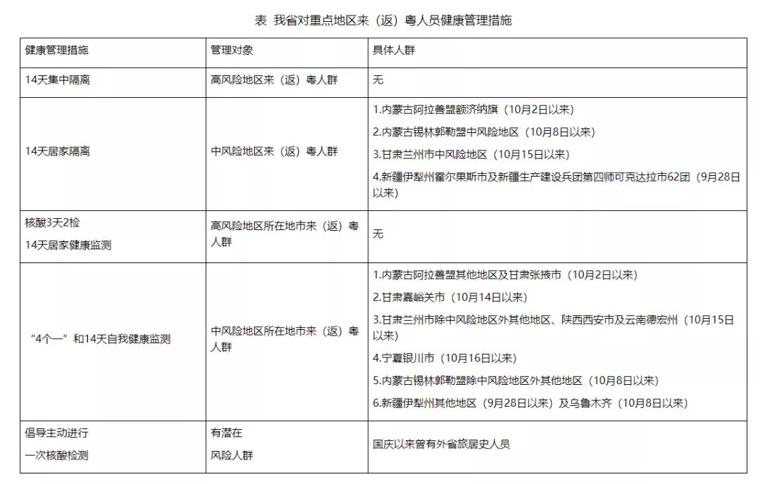 10月20日,广东省疾病预防控制中心官网更新了对重点地区来(返)粤人员健康管理措施。