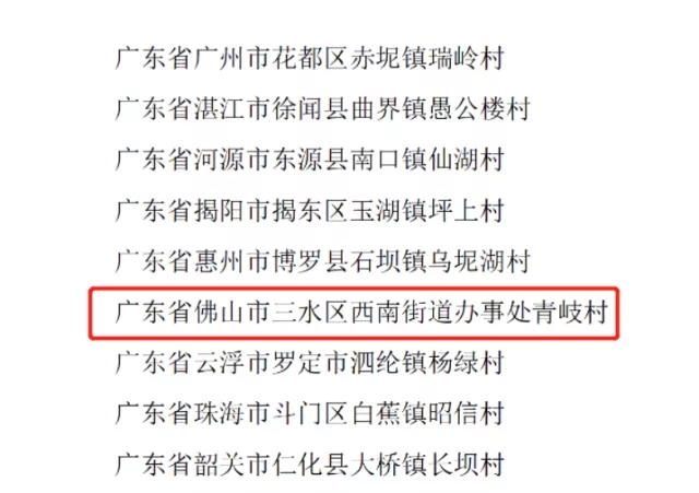 10月20日,农业农村部公示2021年全国乡村特色产业十亿元镇亿元村名单,广东省共9个村上榜,佛山市三水区西南街道办事处青岐村成佛山唯一上榜村。