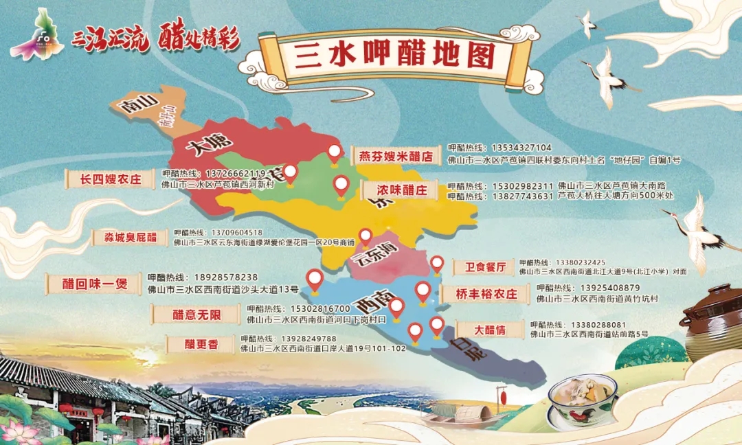 三水长寿醋远近闻名,街头小巷也开了无数家醋店、醋庄。相关资料显示,长寿醋距今已有约2000多年的历史,以往三水女性在疲劳时将酿造的米醋直接饮用,作为解暑饮料。