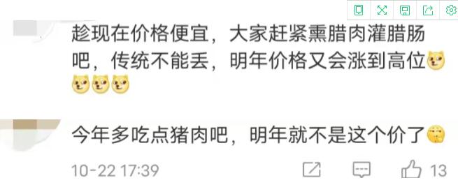据@人民网,10月20日,农业农村部畜牧兽医局负责人孔亮表示,预计今年四季度到明年一季度上市的肥猪同比还将明显增长,生猪供应相对过剩局面仍将持续一段时间,如不实质性调减产能,猪价低迷态势难以扭转。据农业农村部监测显示,今年1月下旬开始,猪肉价格连续8个月回落。