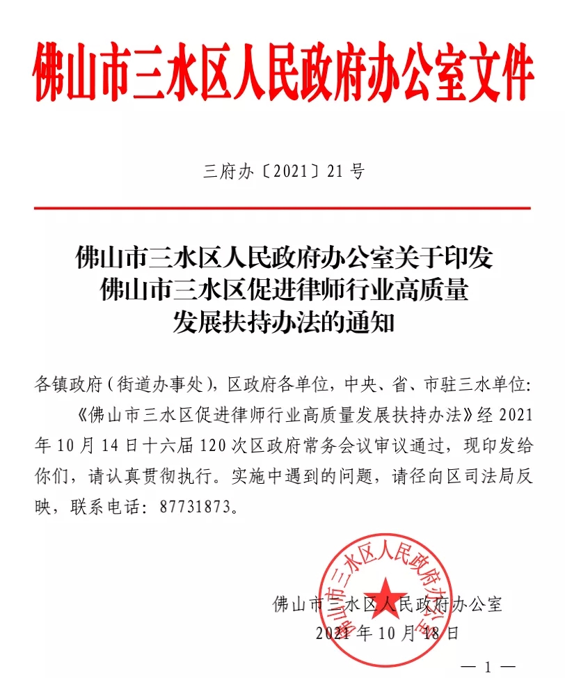 该《扶持办法》共有六章二十条,包括总则、扶持范围、扶持措施、申请扶持程序、退出机制、附则,于2022年1月1日开始实施。该办法的出台将进一步推动我区律师行业壮大发展,助力法治三水建设,助力我区贯彻落实市委一号改革工程,打造法治化营商环境。