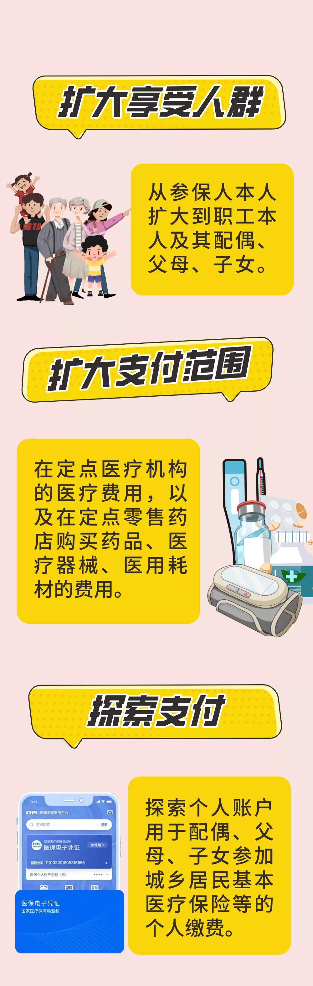 今年,国务院办公厅发布《国务院办公厅关于建立健全职工基本医疗保险门诊共济保障机制的指导意见》。拓宽个人账户的使用范围,实现家庭共济