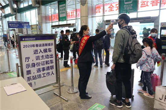 顺德客运总站内,工作人员给进站旅客检测体温。/顺德客运总站供图