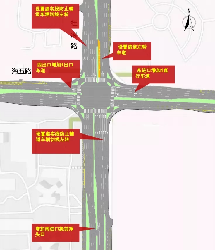 目前,增加东西向进出口车道、设置掉头开头和虚实线等措施已实施,北进口已打开借道左转开口,增加了借道左转信号控制设施,10月28日将正式启用借道左转通行,届时,请广大车主进入借道左转区域时自觉遵守交通信号灯指引,按规定借道行驶,共同营造安全和谐的交通环境。