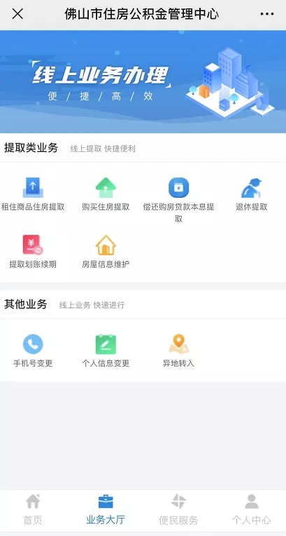 10月13日,佛山市住房公积金管理中心在网上办事大厅上线购房提取业务,市民足不出户即可办理购买自住住房提取住房公积金的业务。10月21日,“购买自住住房提取业务”服务上线官方微信公众号“佛山公积金”。