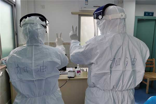 佛山市二医院发热门诊内,两名医护人员背后写着“加油”二字。(佛山市第二人民医院供图)