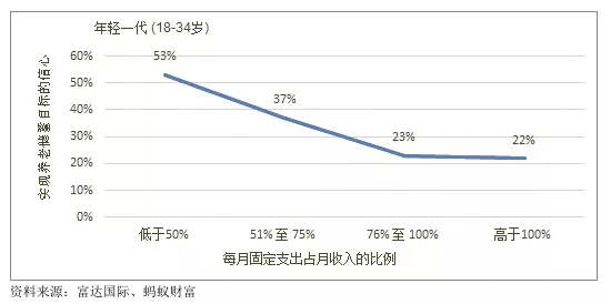 调查还显示,87%的年轻受访者表示,每月的财务收支比例影响到年轻一代对达成养老财务目标的信心,合理有效的预算规划具有积极意义。数据显示,每月固定生活支出金额低于总收入50%的受访人,对实现养老储备目标更有信心。