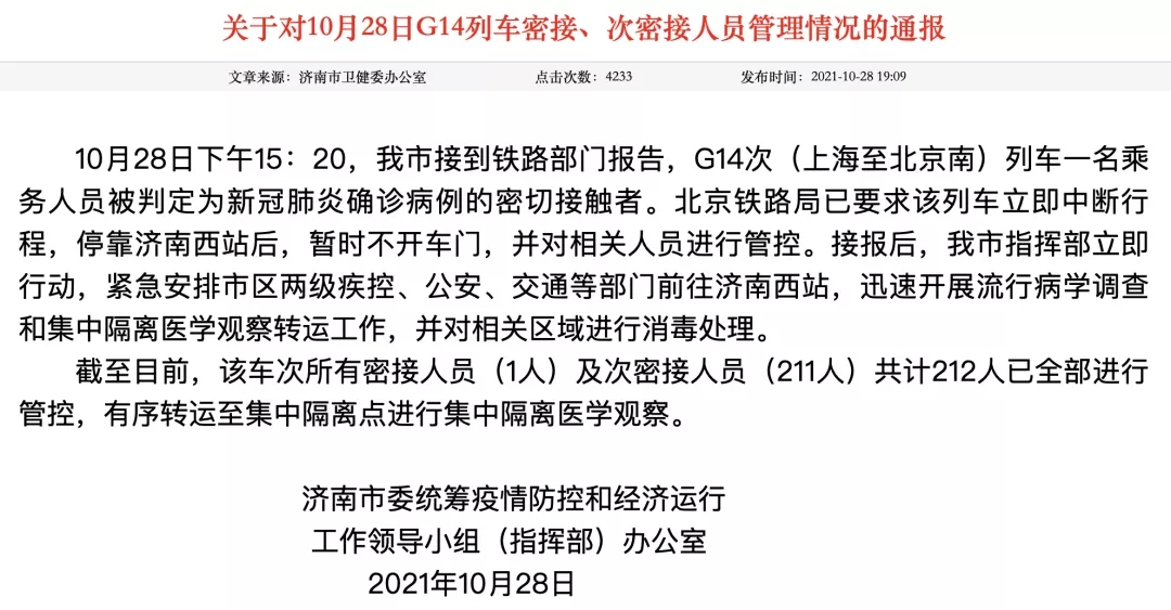 因有列车乘务人员被判定为新冠肺炎确诊病例的密接者,28日下午,两趟终点站为北京南站的高铁分别在山东济南西站、河北沧州西站中断行程,相关部门人员迅速开展流行病学调查和集中隔离医学观察转运工作,并对相关区域进行消毒处理。