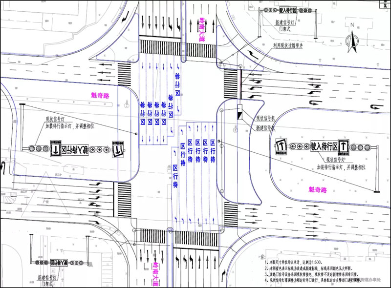 本次魁奇路-岭南大道路口南北方向均设置待行区,并新增待行区指示屏和LED文字提示屏,请过往车辆按照相关指引标志通行。