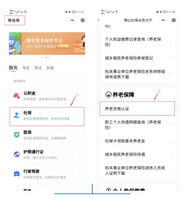 进入“粤省事”小程序点击选择“社保”服务,进入“佛山社保业务大厅”,点击选择“养老资格认证”,后按指示操作即可完成认证。