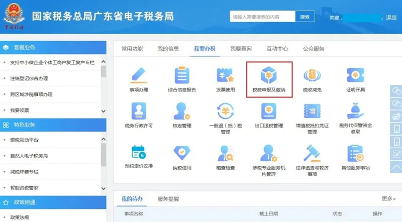 01、登录“广东省电子税务局”——“我要办税”——“税费申报及缴纳”。