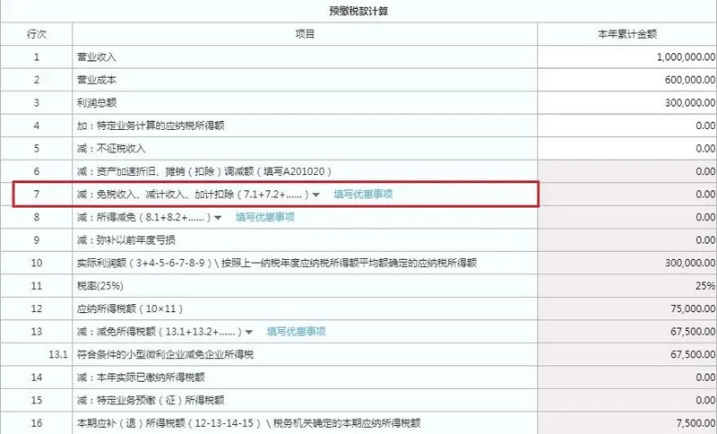 06、填写收入、成本等数据,点击行次7“免税收入、减计收入、加计扣除”填写优惠事项。