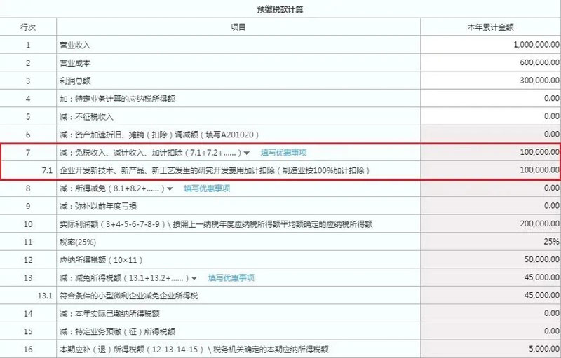 1、2021年前三季度企业开发新技术、新产品、新工艺发生的研究开发费用为10万元,未形成无形资产计入当期损益,按照实际发生额的100%在税前加计扣除,10月份预缴申报时可享受加计扣除10万元,在相应栏次填写结束后点击确定。