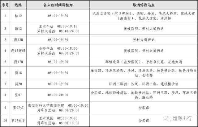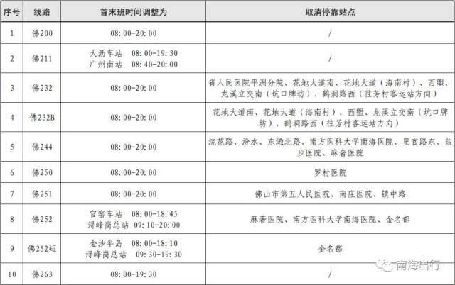 为落实新型冠状病毒疫情防控工作,保障广大市民身体健康和出行安全,2020年2月5日起,南海区部分公交线路对首末班时间实施调整,并取消停靠部分站点。
