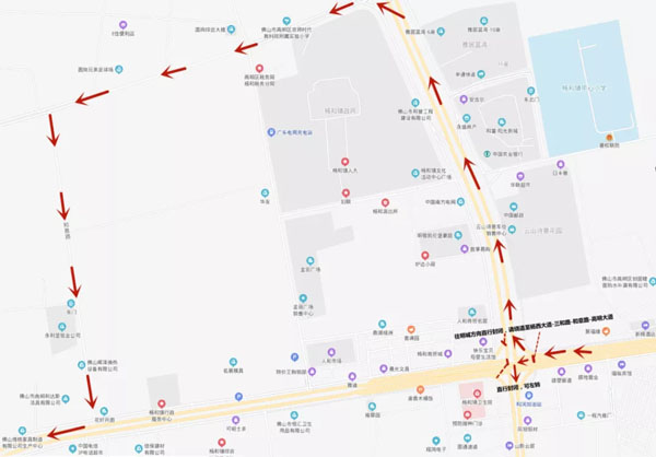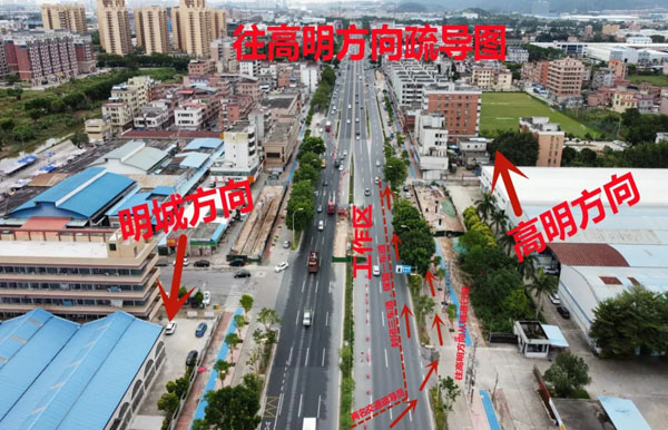 位于清泰村侧路段(从明城往荷城方向),高明大道将逐步封闭三条主车道,保留一条主车道及辅道通行。
