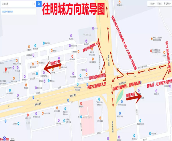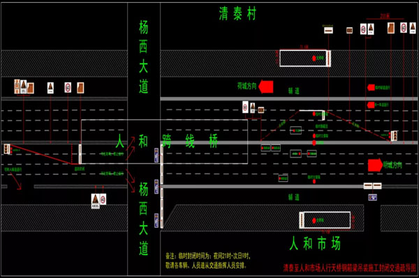 因杨和镇清泰至人和市场人行天桥建设工程需要,2021年11月3日晚上20时起,位于高明区高明大道中的人和跨线桥及人和市场路段将实行交通管制,具体措施如下: