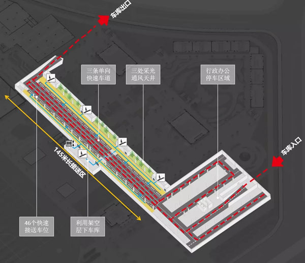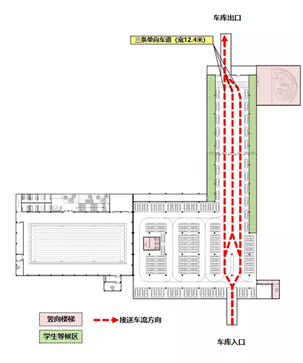 两所学校首创智能接送区,通过科学设置接送等待空间、精心组织接送流线、灵活运用智能化设备和技术手段,达到在学校车库内集中、快速接送效果。同时方便疏导接送车辆,避免出现因放学接送导致大规模交通堵塞的问题,创造性地实现“家长进车库即分配接送车位,学生在等候区同步收到家长的接送位置”的便捷接送场景。