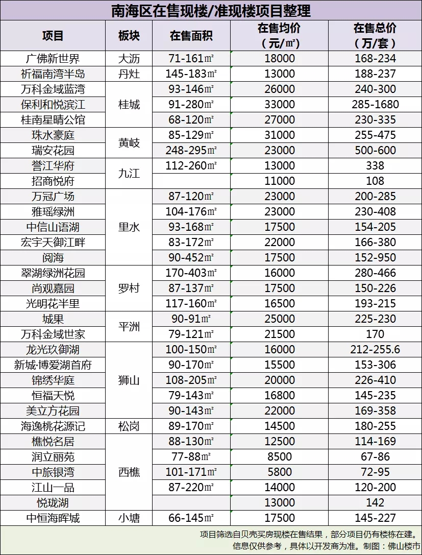 贝壳买房平台显示,南海区目前有31个项目有现楼在售,除了九江的招商悦府、誉江华府2个项目,还有西樵的多个“老”项目,其余均分布的桂城以北的大沥、狮山、罗村板块。
