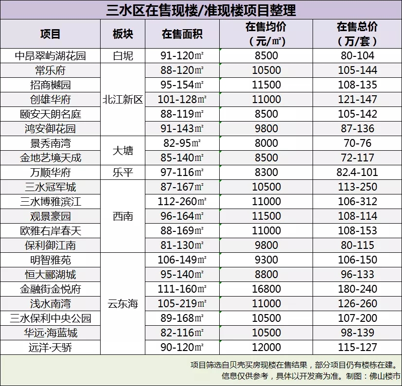 三水区目前有21个项目有现房在售,基本都分布在三水新城板块,另外白坭、大塘、乐平也有一两个项目。