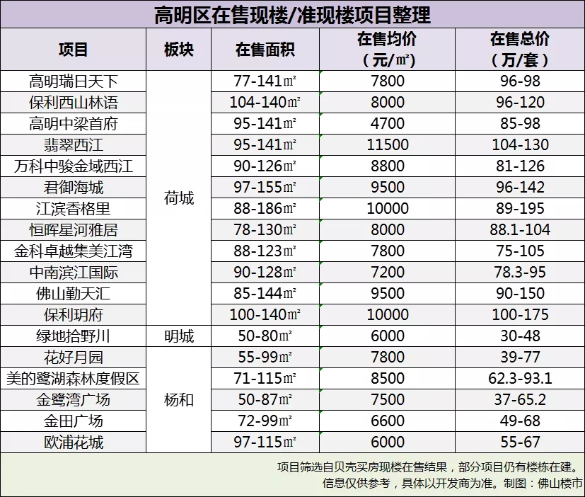 作为今年一二手交易都低迷的高明区,目前在售项目有现楼的倒还不少,根据贝壳买房显示,目前有17个项目有现楼在售。主要分布在荷城、杨明板块。