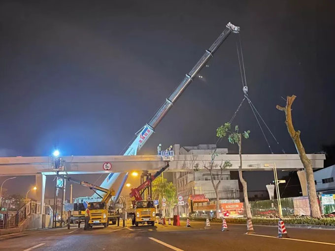 11月3日晚上,在项目现场可以看到,数十名工人通宵达旦,进行着紧张的钢箱梁吊装作业。