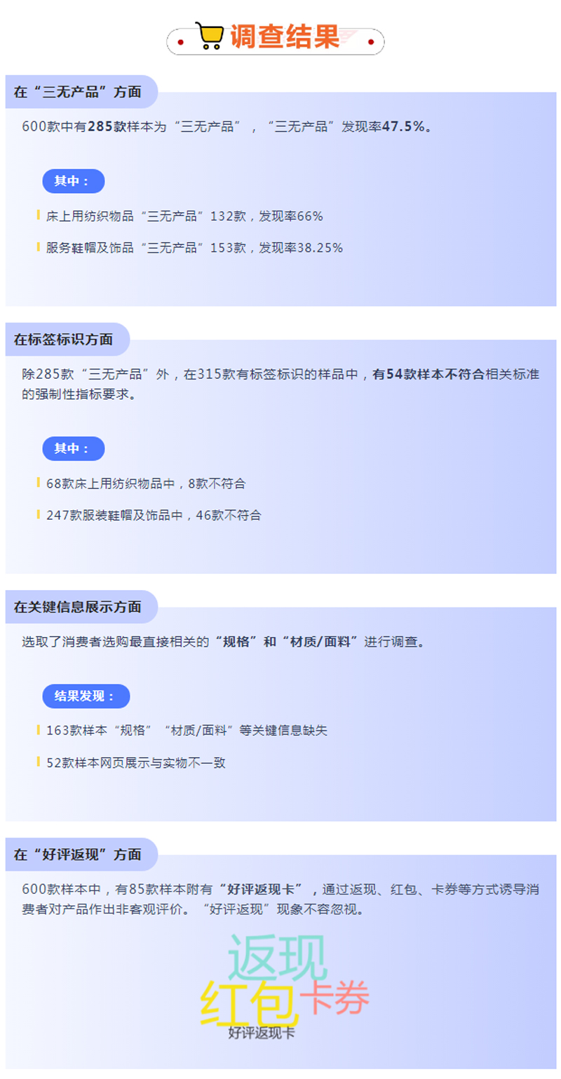 调查重点针对网售商品是否为“三无产品”、标识标志是否符合国家强制性标准、商品关键信息展示是否与实物一致、经营者是否通过“好评返现”诱导好评等四方面内容开展。