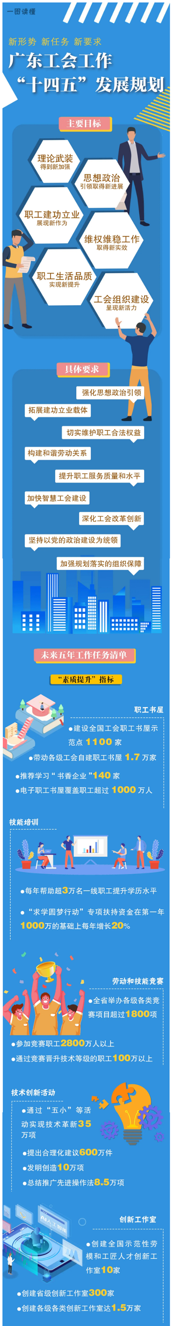 近日,广东省总工会发布《广东工运事业和工会工作“十四五”发展规划》(以下简称《规划》),明确“十四五”时期广东工运事业和工会工作发展的总体思路、发展目标、主要任务和重大举措。