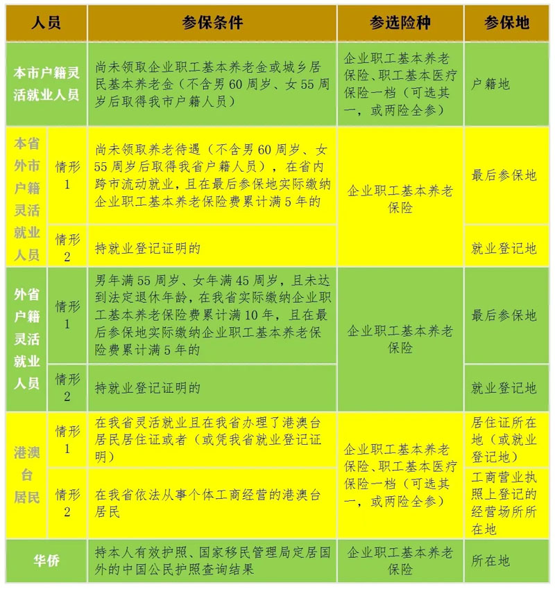 根据我省灵活就业人员参保政策规定,符合参保条件的灵活就业人员,按照自愿参保原则,可以以个人身份参加企业职工基本养老保险。具体参保对象为适用于法定劳动年龄内的下列人员: