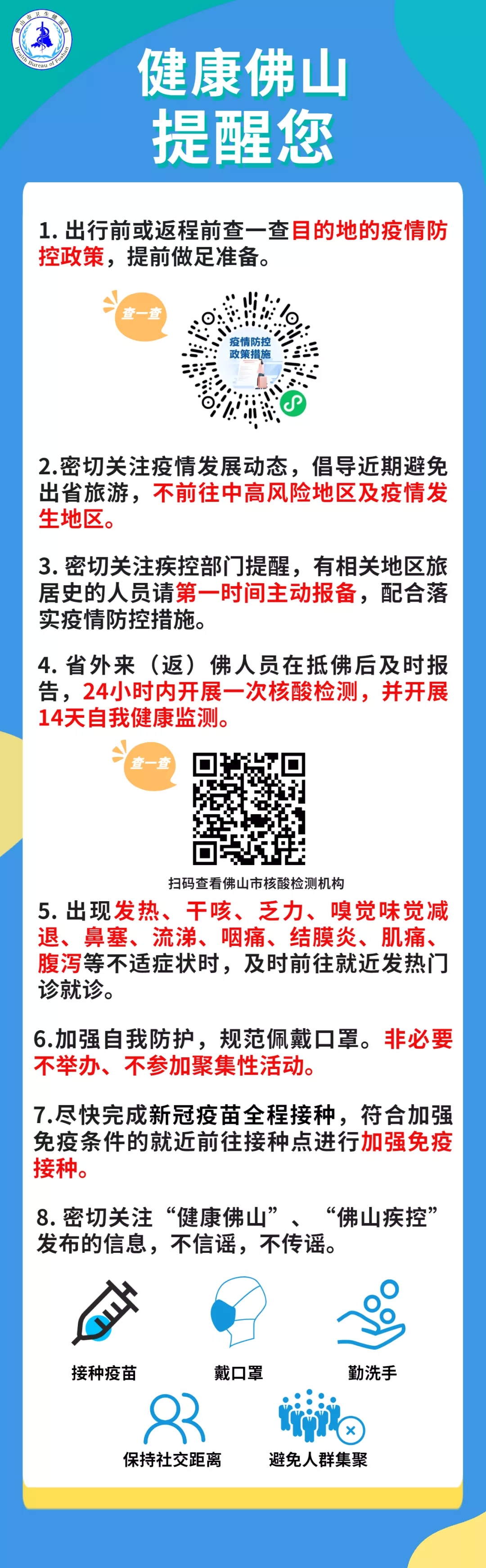 二、做好人员健康监测。请各企业对进出人员严格执行扫码、测温、戴口罩等防疫措施,做好健康登记和行程码查验工作。密切关注员工健康状况,自省外来(返)佛员工要在抵佛后及时向所在村(居)委报告,24小时内进行一次核酸检测,并开展 14天自我健康监测。一旦出现发热、干咳、乏力、嗅觉味觉减退、鼻塞、咽痛、结膜炎、肌痛、腹泻等不适症状时立即报告所在(村)居委并就近到发热门诊就诊,主动告知医生自己的旅行史,就诊过程中请做好个人防护,避免乘坐公共交通工具。