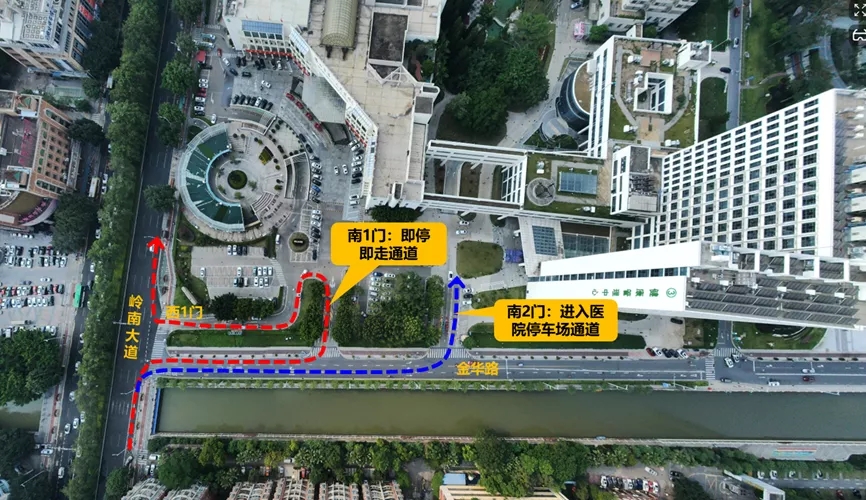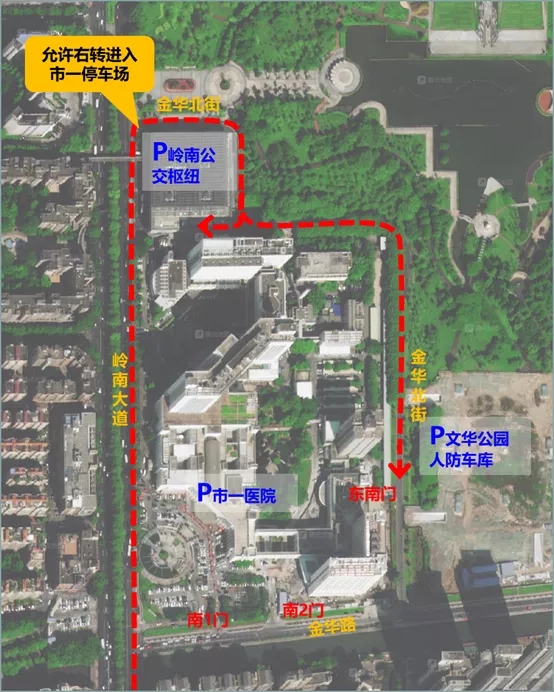 金华路(岭南大道-医院南2门)路段调整为西往东单行。需要从岭南大道进入市一医院停车的车辆,请从南2门进入医院。(图一,蓝色路线)