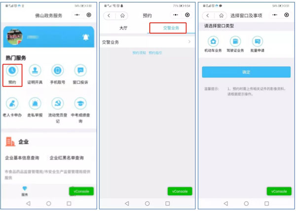2、实名认证后,进入“佛山政务服务”公众号,点击“预约”选择“交警业务”;
