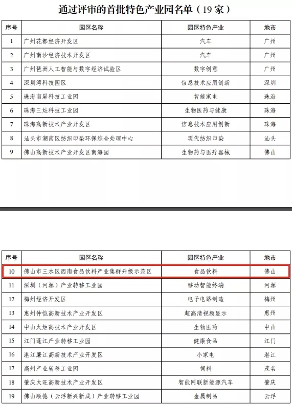 广东省制造强省建设领导办公室公示广东省首批特色产业园名单,佛山市三水区西南食品饮料产业集群升级示范区以食品饮料特色产业成功入选。
