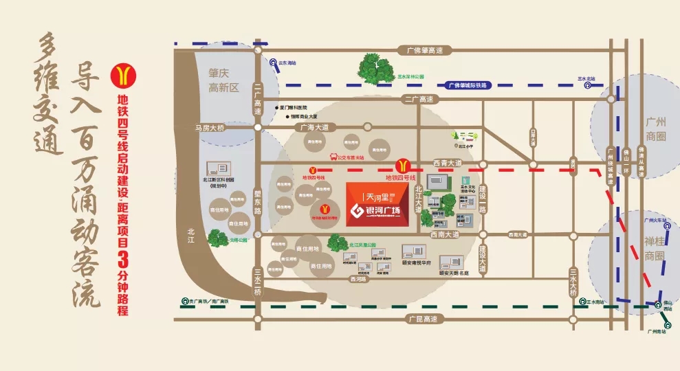 地处三水北江新区城芯的银河广场·天河里,西临即将动工的佛山地铁4号线,区位优越,人气鼎盛,是佛山首个绿色生态沉浸式无感体验的消费购物娱乐中心。
