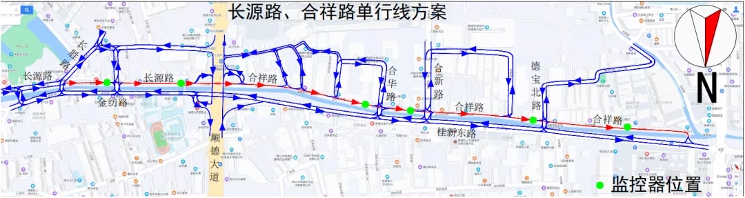 长源路(长胜路至顺德大道路段)仅允许机动车辆由东往西方向行驶;合祥路(顺德大道至格兰仕新村桥头路段)仅允许机动车辆由东往西方向行驶。