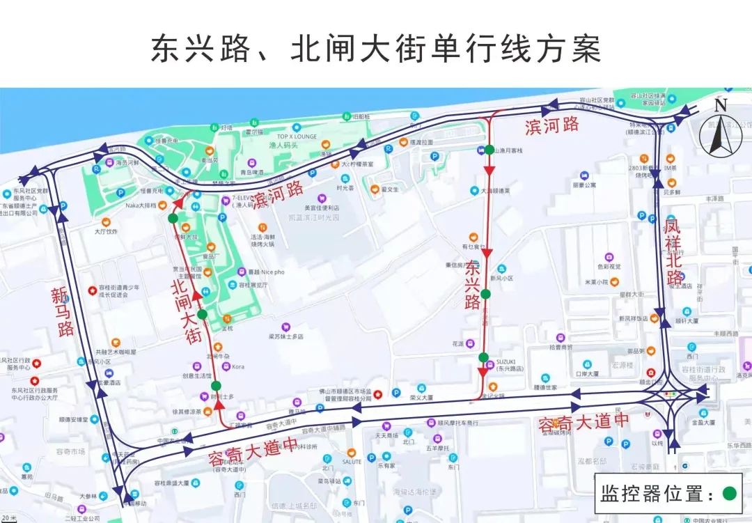 东兴路(滨河路至容奇大道路段)仅允许机动车辆由北往南方向行驶;北闸大街(容奇大道至滨河路路段)仅允许机动车辆由南往北方向行驶。