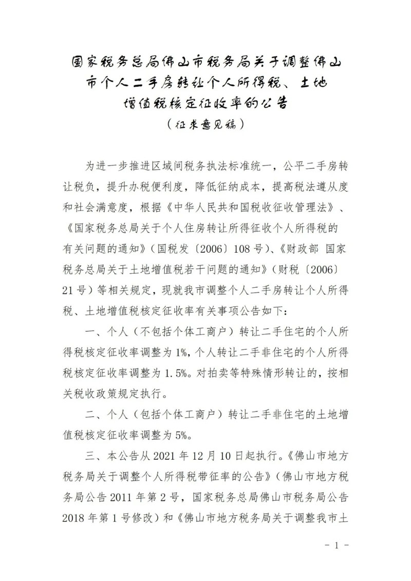 佛山二手房转让个税拟降至1%!12月10日执行!