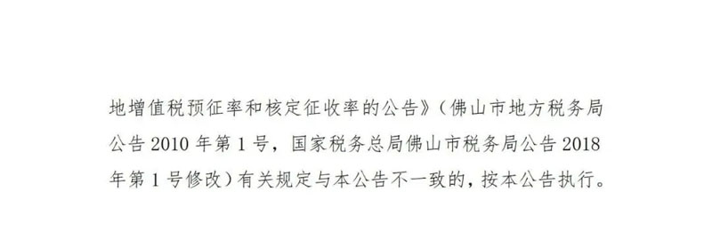 三、本公告从2021年12月10日起执行。《佛山市地方税务局关于调整个人所得税带征率的公告》(佛山市地方税务局公告2011年第2号,国家税务总局佛山市税务局公告2018年第1号修改)和《佛山市地方税务局关于调整我市土地增值税预征率和核定征收率的公告》(佛山市地方税务局公告2010年第1号,国家税务总局佛山市税务局公告2018年第1号修改)有关规定与本公告不一致的,按本公告执行。