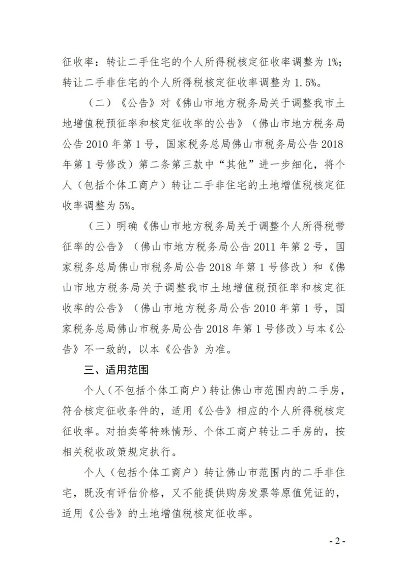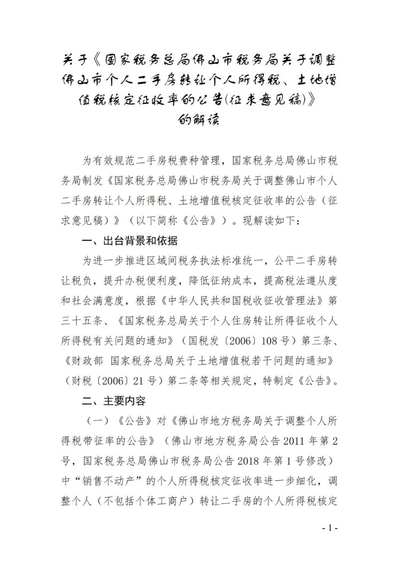 11月9日,佛山市税务局发布个人二手房转让个人所得税、土地增值税核定征收率新政征求意见稿。
