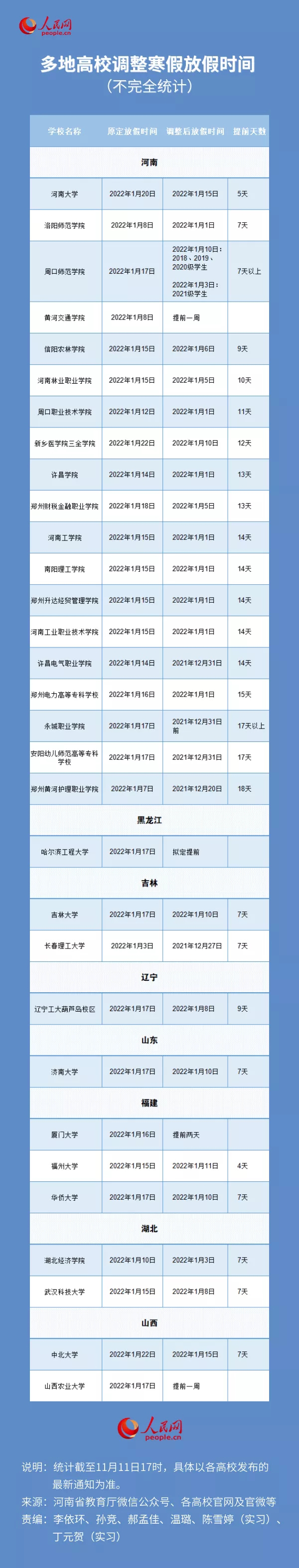 为进一步做好校园疫情防控工作,保障师生员工健康安全,多地高校根据国内疫情形势和学校实际情况,结合师生意愿和需求,陆续调整寒假放假时间↓