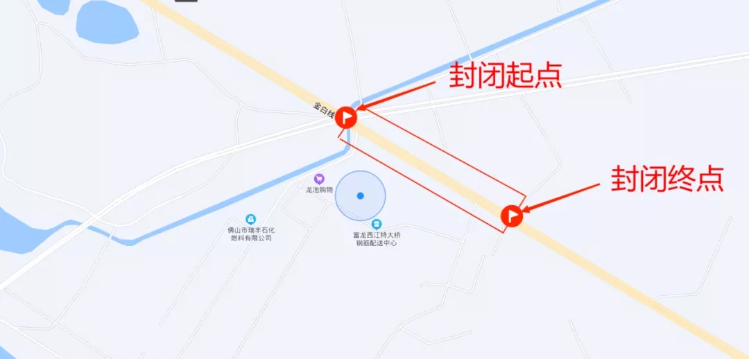 为保证富龙西江特大桥钢梁架设安全施工,在施工期间搭设门洞支架及钢梁架设时,对金白线龙池村红绿灯向广明高速方向道路沿线600m进行单边封闭施工。施工时间为2021年11月18日至2022年9月15日,不便之处敬请谅解。