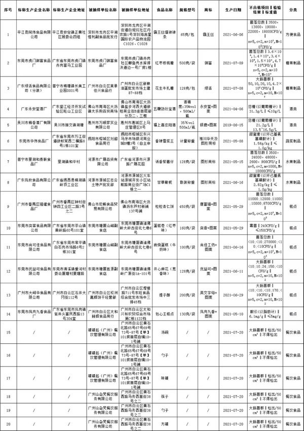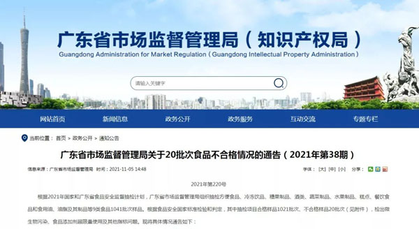 11月5日,广东省市场监督管理局组织抽检公布了20批次不合格样品。涉辣条、牛轧糖、麻花等常见零食还有餐具等。