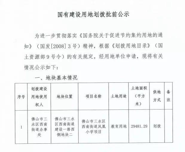 《国有建设用地划拨批前公示(佛山市三水区西南街道建设一路西侧地块二——佛山市三水区西南街道凤凰小学项目)》。