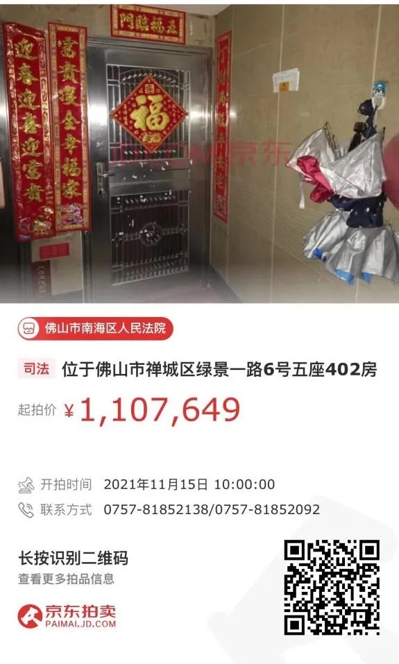 标的物:位于佛山市禅城区绿景一路6号五座402房。房屋建筑面积128.04平方米、房屋套内建筑面积106.02平方米,起拍价110.7649万元。
