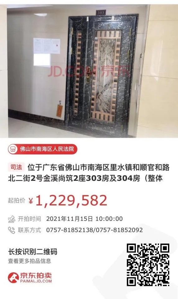 标的物:位于广东省佛山市南海区里水镇和顺官和路北二街2号金溪尚筑2座303房及304房(整体拍卖)。其中303房建筑面积91.93平方米、套内建筑面积71.17平方米,其中304房建筑面积75.36平方米、套内建筑面积58.34平方米,起拍价122.9582万元。