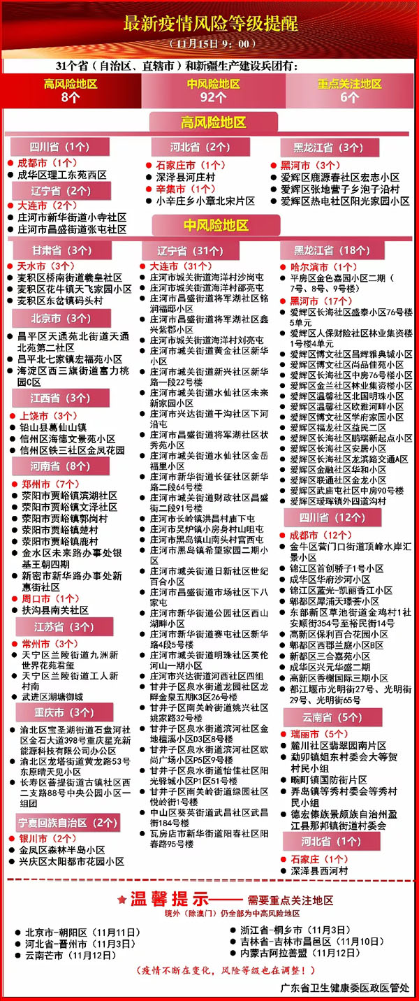 积极引导师生减少跨省流动,避免前往疫情发生地。如确需前往,离佛前要向所在学校、所在单位报备,并提醒途中要全程做好个人防护、减少聚集、不前往人员密集场所。返回后24小时内做一次核酸检测,并按疫情防控要求落实健康管理。图片佛山疾控提醒:有需要的市民朋友可到以下地点做核酸检测