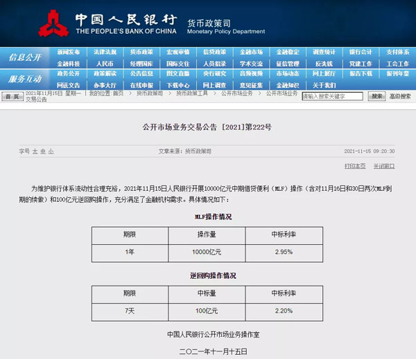 为维护银行体系流动性合理充裕,2021年11月15日人民银行开展10000亿元中期借贷便利(MLF)操作(含对11月16日和30日两次MLF到期的续做)和100亿元逆回购操作,充分满足了金融机构需求。