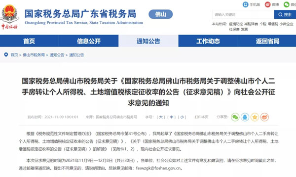 11月9日,佛山市税务局发布个人二手房转让个人所得税、土地增值税核定征收率新政征求意见稿。