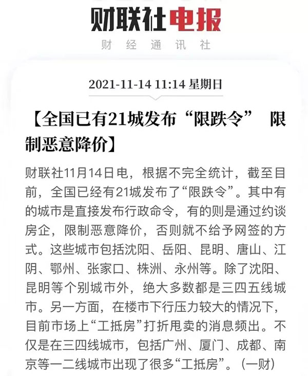 据财联社消息,截止目前全国至少已有21城发布“限跌令”,限制房企恶意降价。
