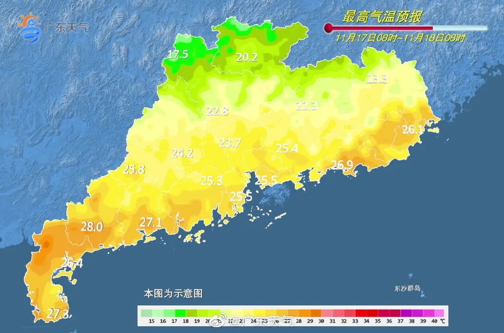 其中,11月16日受高空槽影响,全省大部多云为主,云量增多,有分散小雨(粤北降水相对明显),昼夜温差减小。