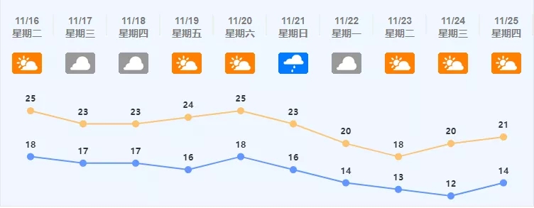 11月19日至20日多云,晨晚最低气温分别为16℃、18℃,日间气温分别逐日小幅升至24℃、25℃。
